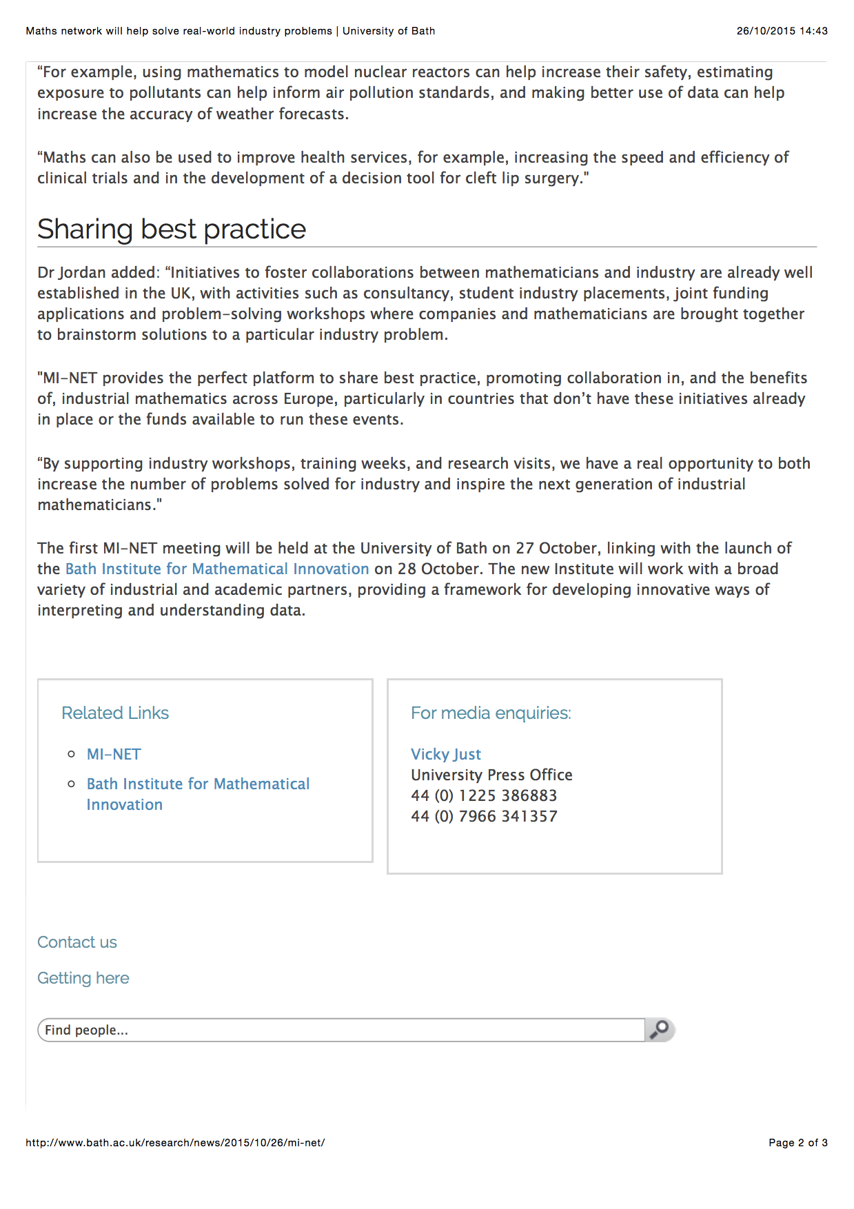 We were delighted to see that the University of Bath has written a nice piece about MI-NET and has got it up on their web page! We are looking forward to tomorrow when we will kick off the day with a Core Group and a Management Committee meeting. In the afternoon we will be welcoming 50 delegates to our workshop on ‘Current Practice in Industrial Mathematics‘.